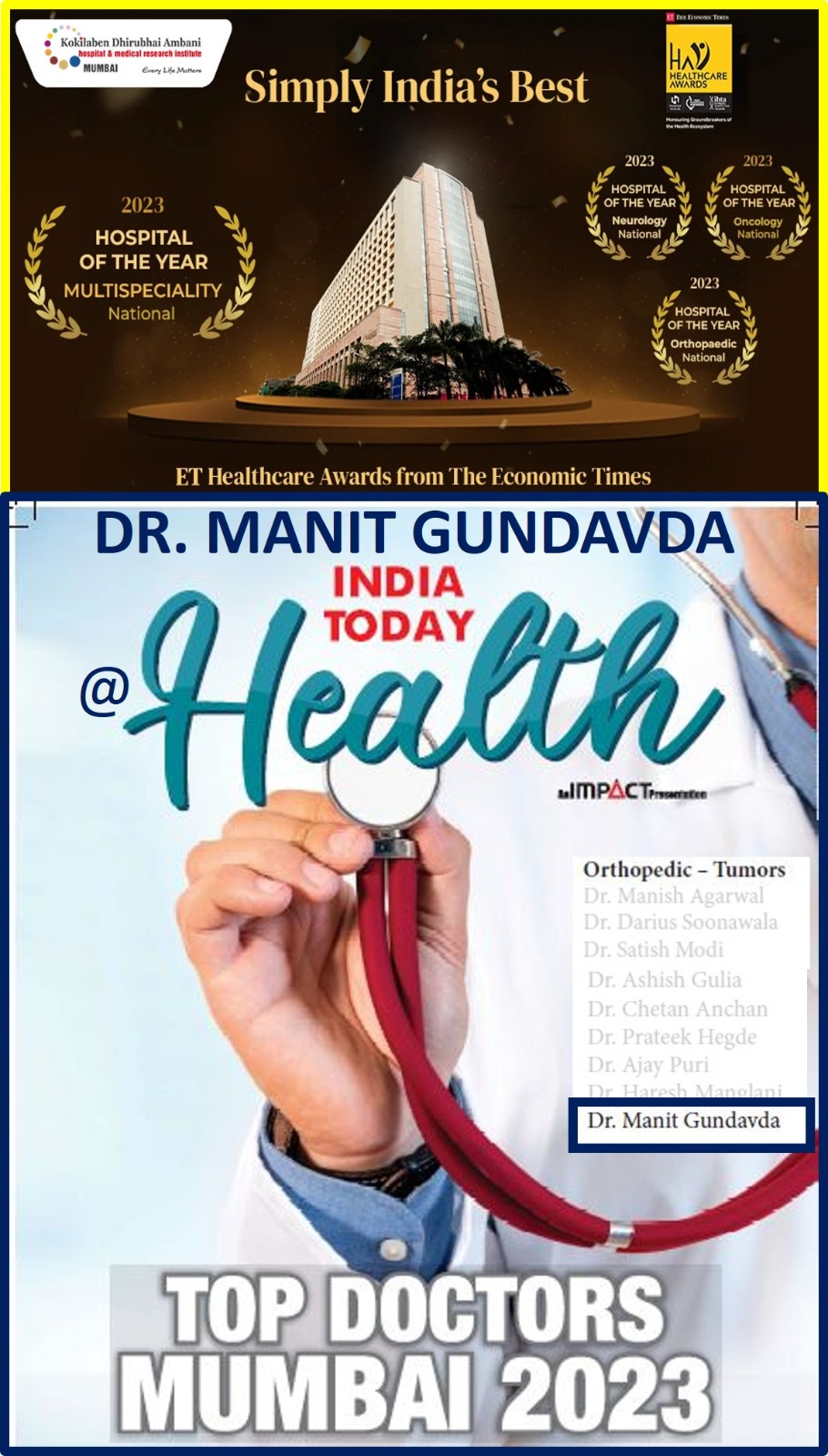 Dr. Manit K. Gundavda is a Fellowship Trained Specialist Consultant in Orthopaedic Oncology, specializing in Bone and Soft Tissue Tumors and Complex Arthroplasty, with advanced training from world-renowned institutions, including Mount Sinai Hospital in Toronto, Canada, The Royal Orthopaedic Hospital and NHS Foundation Trust, Birmingham, UK and P.D. Hinduja Hospital in Mumbai, India.